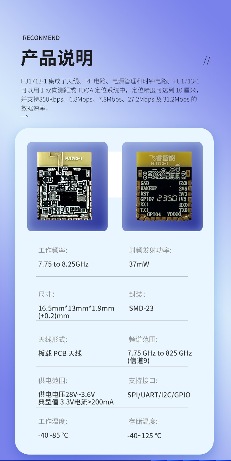 FU1713-1 集成了天线、RF 电路、电源管理和时钟电路。FU1713-1 可以用于双向测距或 TDOA 定位系统中,定位精度可达到 10 厘米,并支持850Kbps、6.8Mbps、7.8Mbps、27.2Mbps 及 31.2Mbps 的数据速率。